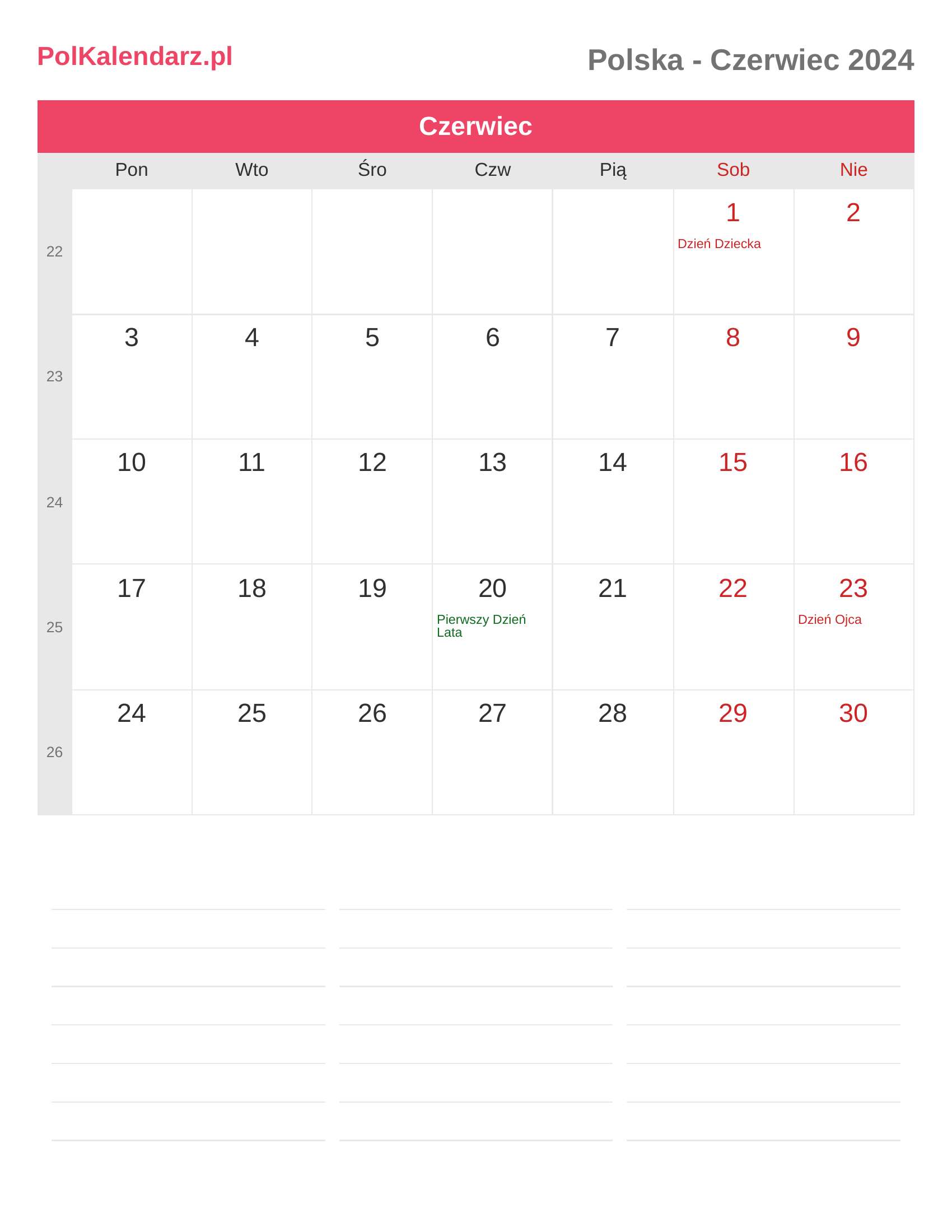 Kalendarz Czerwiec 2024 - Polska