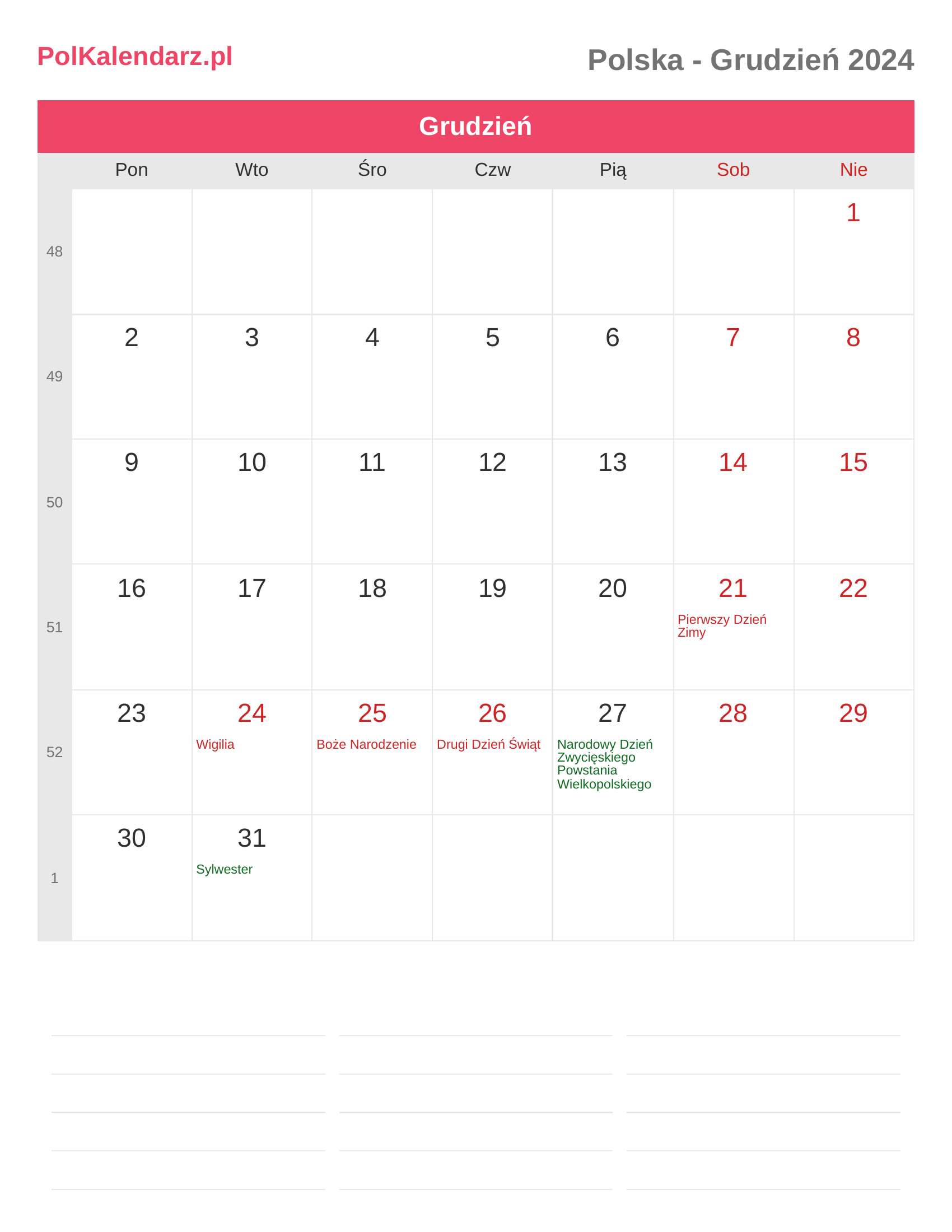 Kalendarz Grudzień 2024 - Polska
