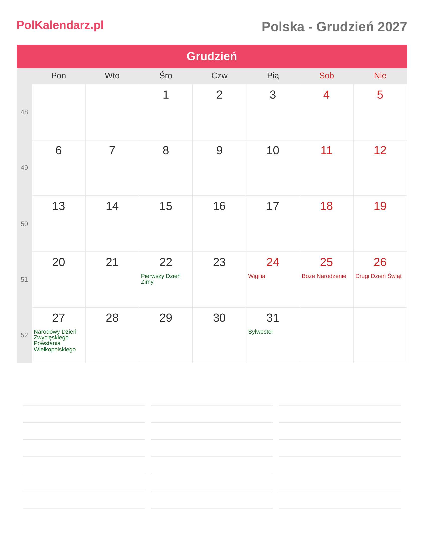 Kalendarz Grudzień 2027 - Polska