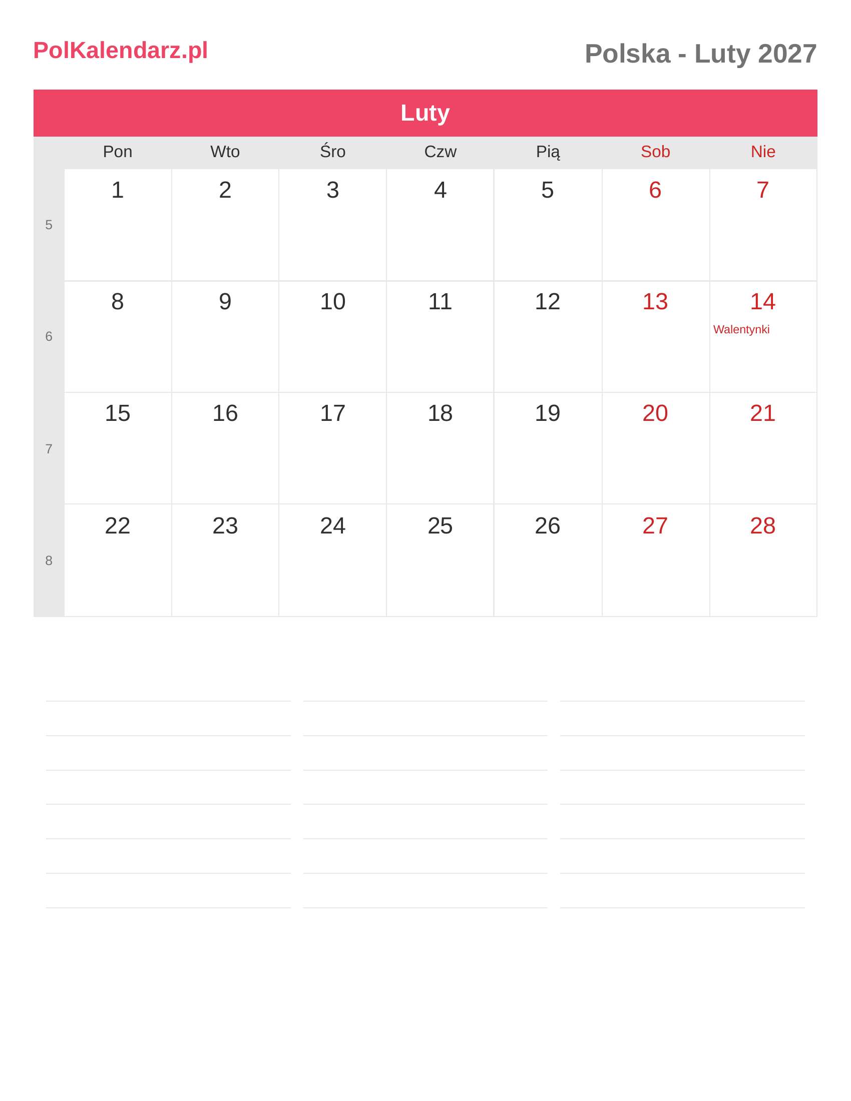 Kalendarz Luty 2027 - Polska
