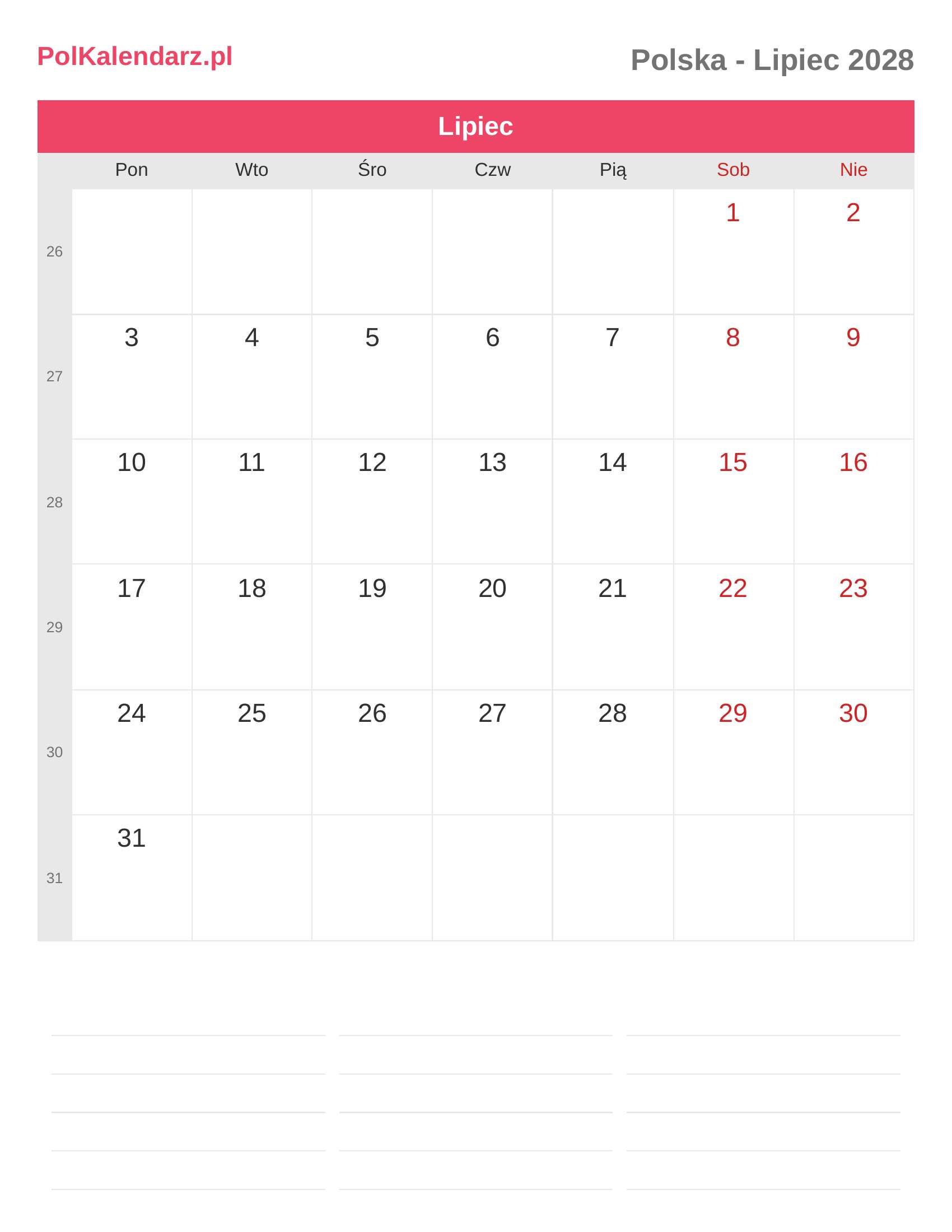 Kalendarz Lipiec 2028 - Polska